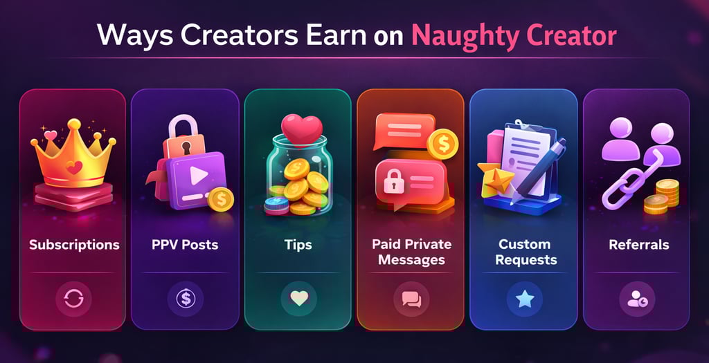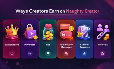 Naughty Creator offers multiple ways for creators to generate income. Here are the primary revenue sources: